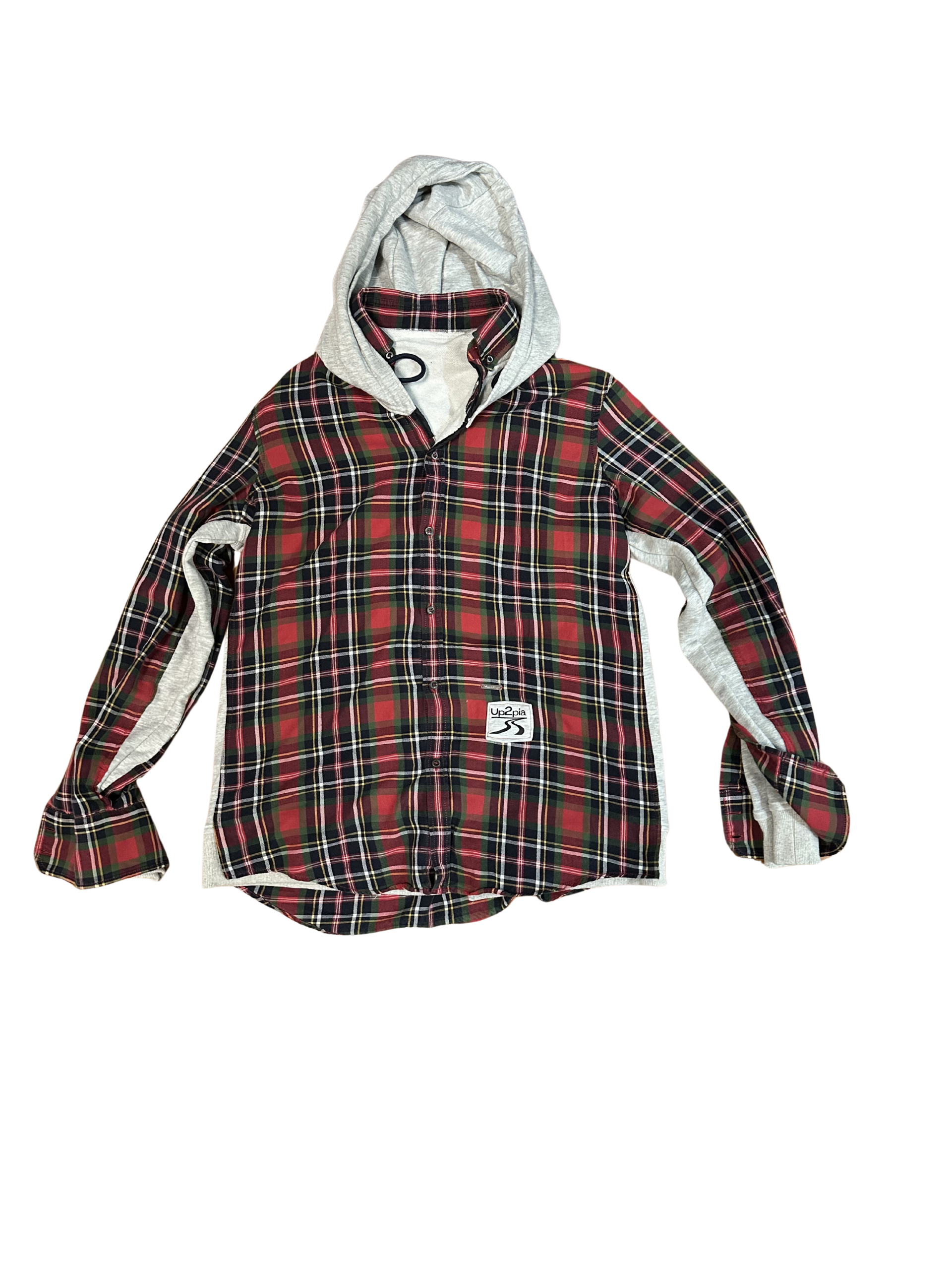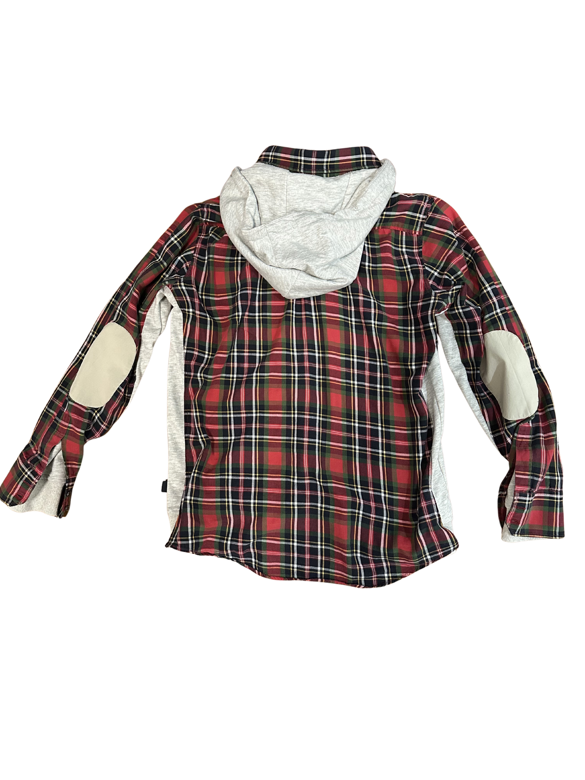This upcycled shirt blends two familiar worlds into something distinctly reworked. The base is a classic red-and-green tartan plaid button-up, but it’s been spliced with soft gray sweatshirt material running down the sides and under the arms. That contrast does a lot—it breaks the rigidity of the plaid and adds a casual, almost athletic comfort to it. The attached gray hood pushes it further into hybrid territory, like a flannel and hoodie fused into one piece.