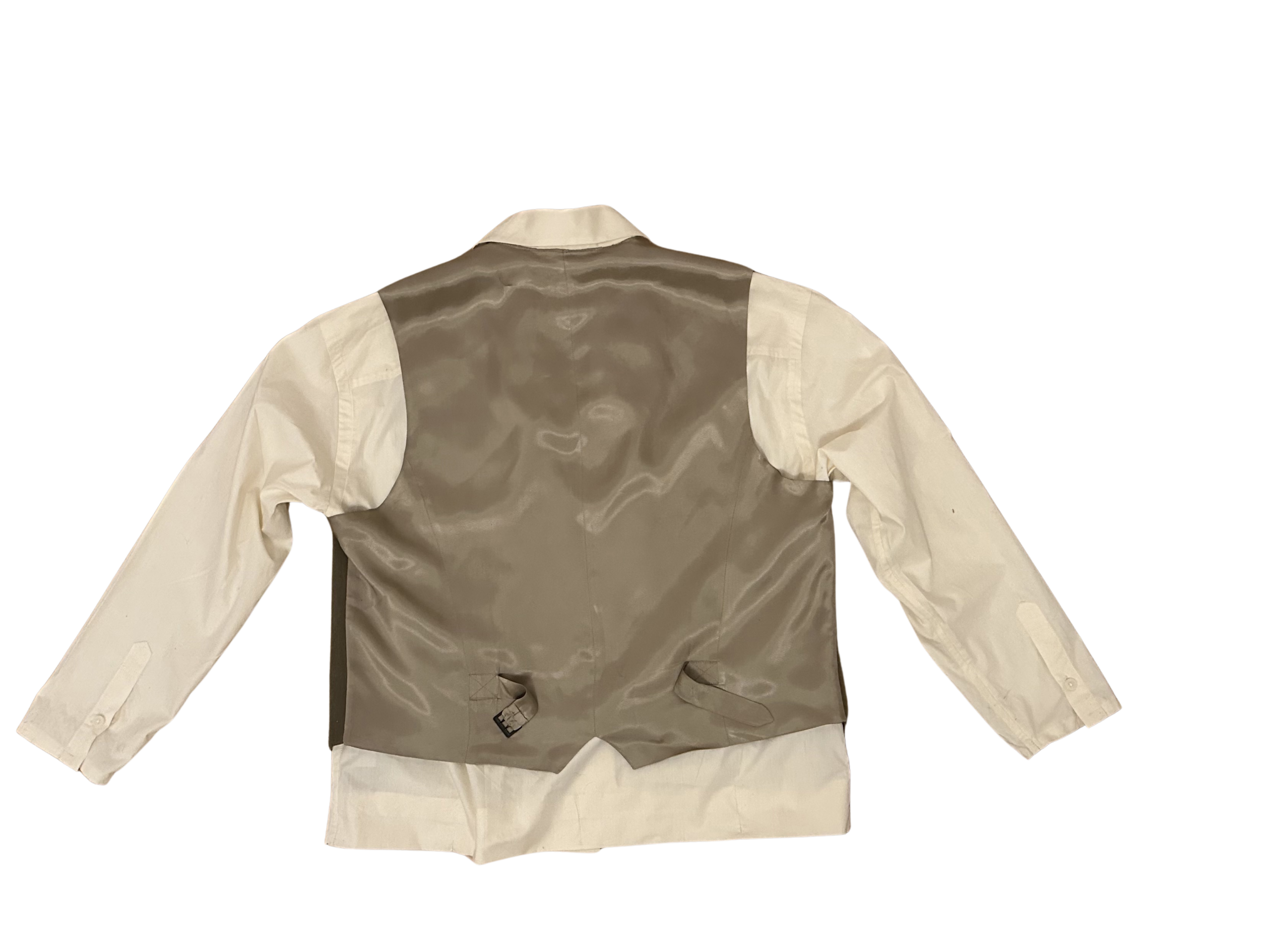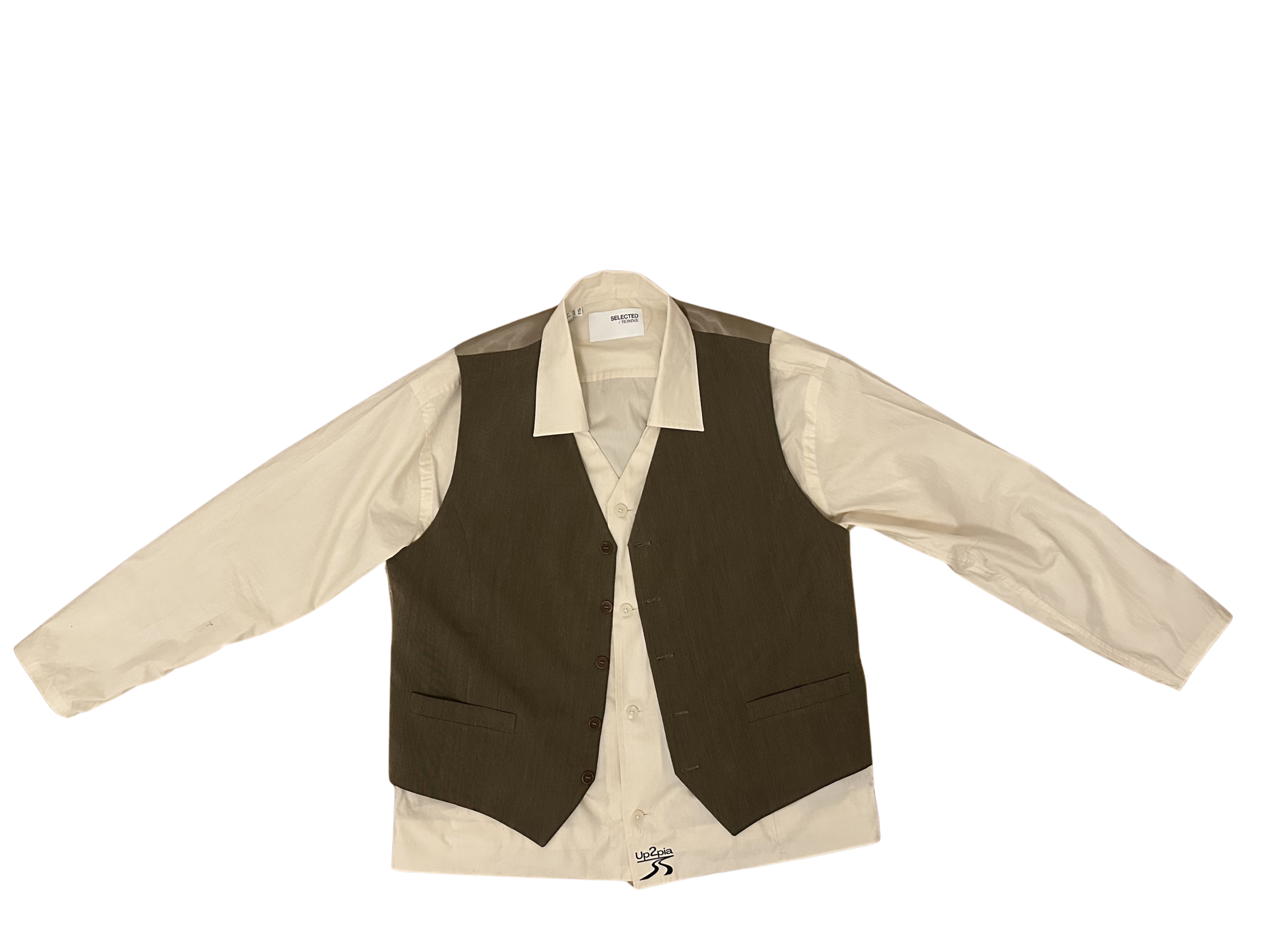 This upcycled shirt reimagines classic tailoring through layering and contrast. The base is a soft, off-white button-up with a relaxed structure, overlaid with a tailored vest panel in an earthy, muted tone. The vest element is seamlessly integrated rather than separate, giving the piece a refined, hybrid identity.