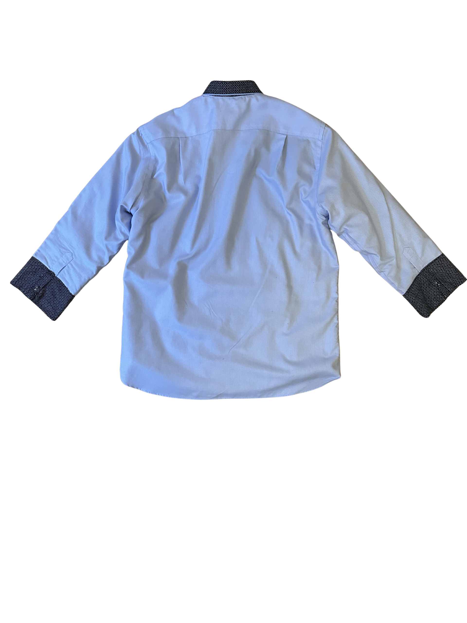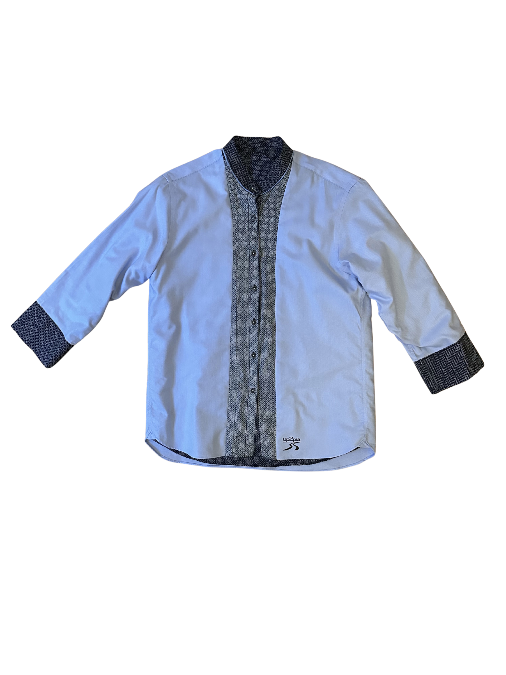This upcycled shirt takes a classic, clean silhouette and reworks it through contrast and texture. The base is a soft light-blue button-up, but it’s interrupted by a vertically inserted patterned panel that runs through the placket and collar, creating a quiet focal point. The same textured fabric appears on the cuffs, tying the design together without overwhelming it.
